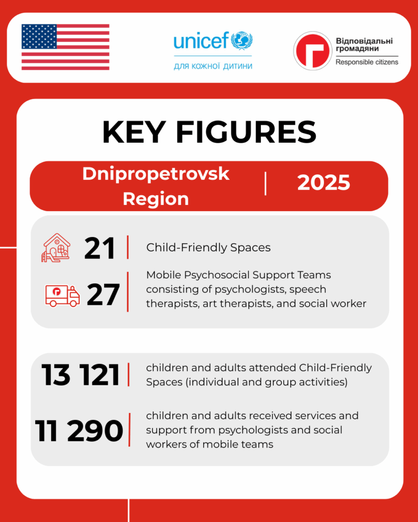 The activities were carried out within the framework of the UNICEF project in Ukraine “Strengthening Community Capacity to Deliver Essential Protection and Resilience Services in Kharkiv, Donetsk, Dnipropetrovsk, and Zaporizhzhia Regions,” implemented by the NGO “Responsible Citizens” with the support of the Government of the United States of America.