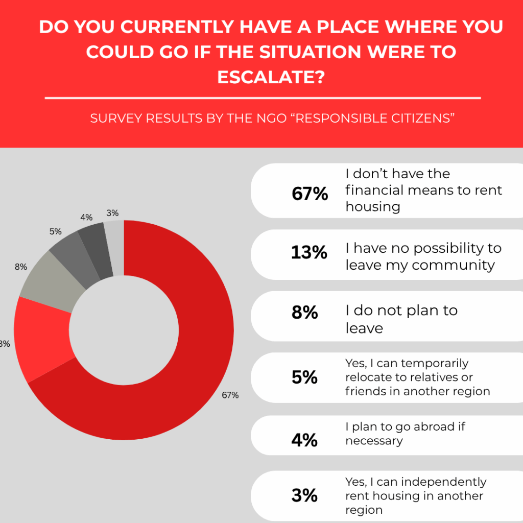 Only 12% of respondents have options for temporary relocation: 5% could move to relatives or friends in another region, 3% are able to rent housing independently, and 4% plan to go abroad if necessary.