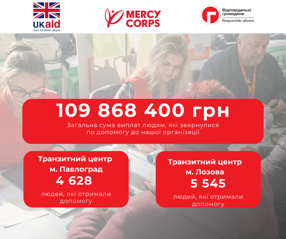 ГО «Відповідальні громадяни» у партнерстві з Mercy Corps Ukraine та за підтримки Уряду Великої Британії забезпечила грошову допомогу на загальну суму понад 109 млн грн, допомагаючи стабілізувати їхнє становище у критичний період після евакуації.
