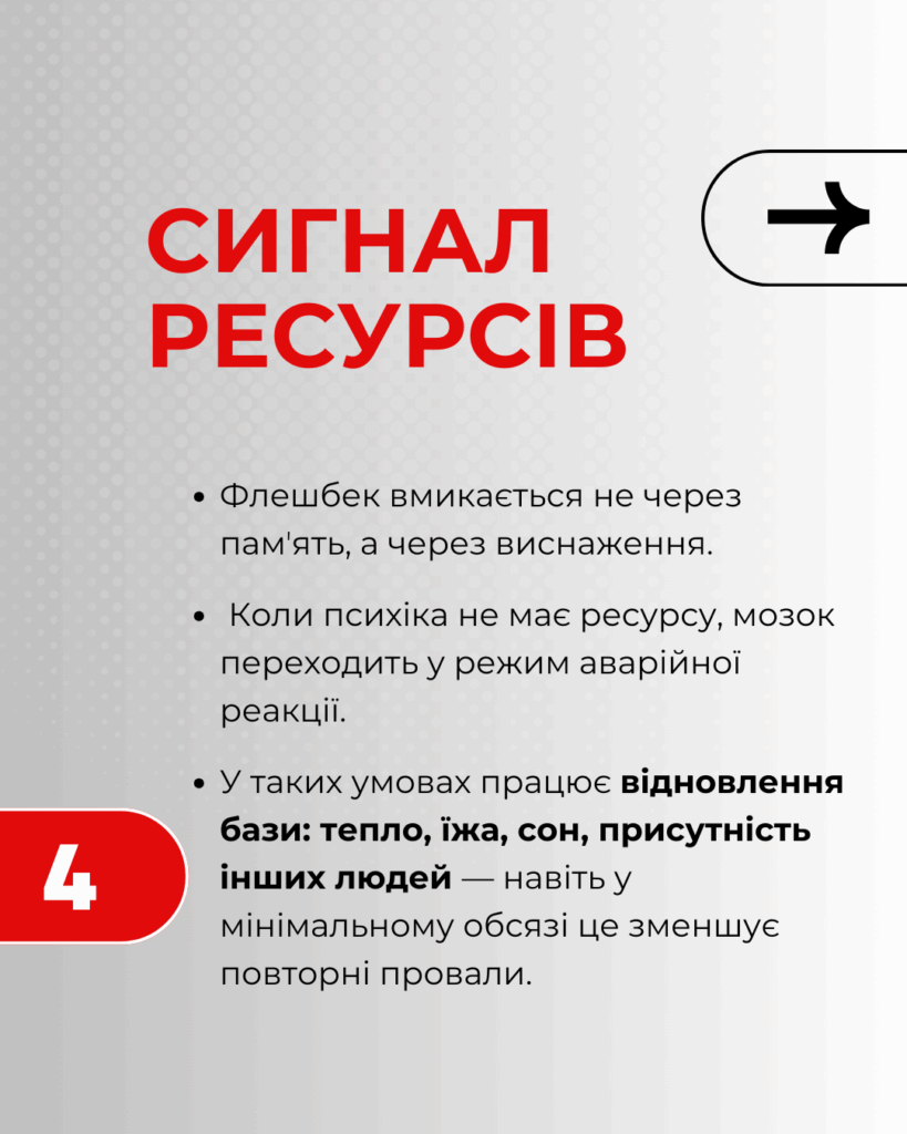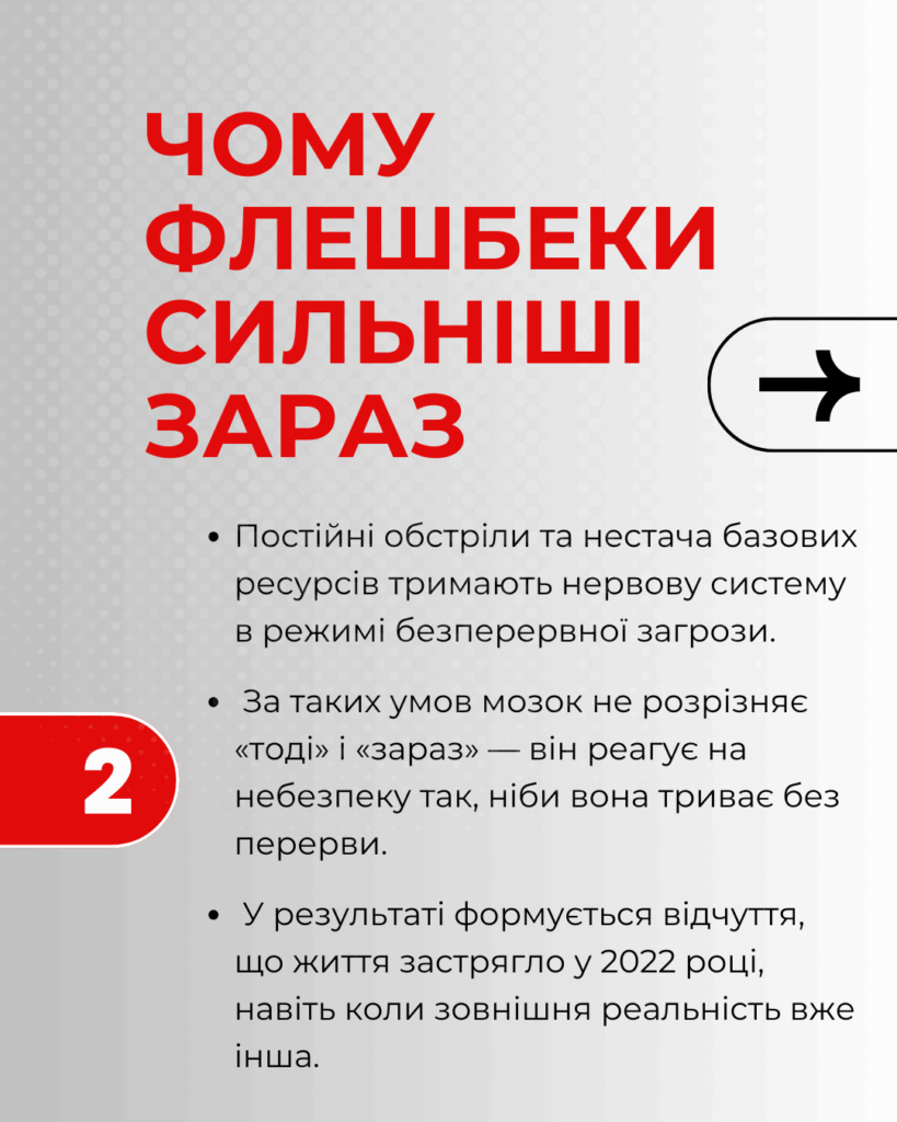 Одна з форм цієї реакції — раптові тілесні або емоційні відгуки на звуки, образи чи новини. Це не звичайні спогади, а автоматична робота мозку, який колись навчився виживати в умовах загрози. Навіть коли реальна небезпека минула, нервова система може на мить повертатися в режим захисту.
